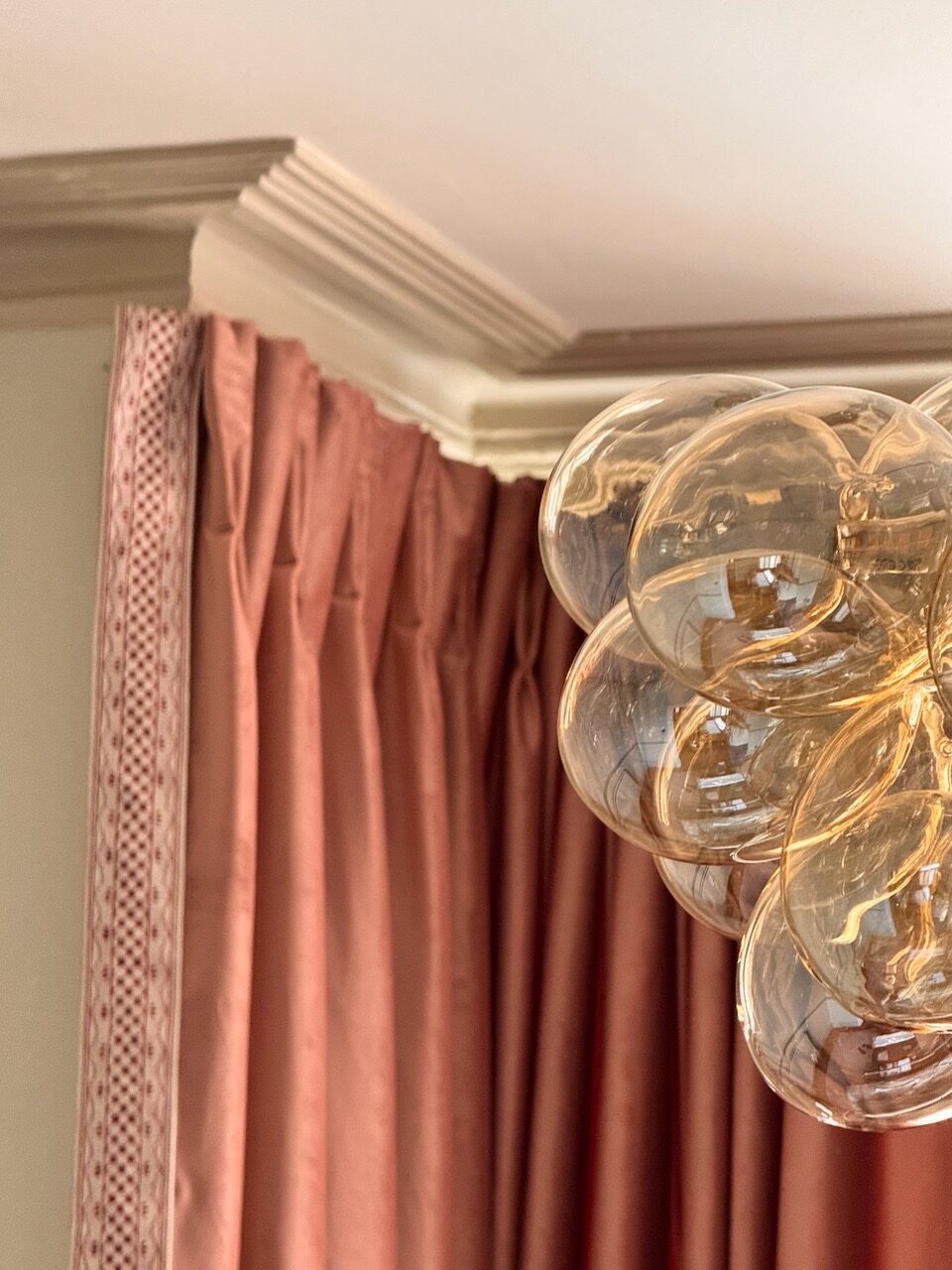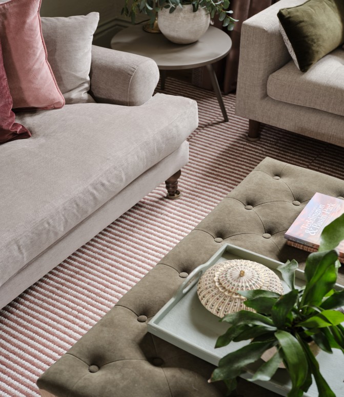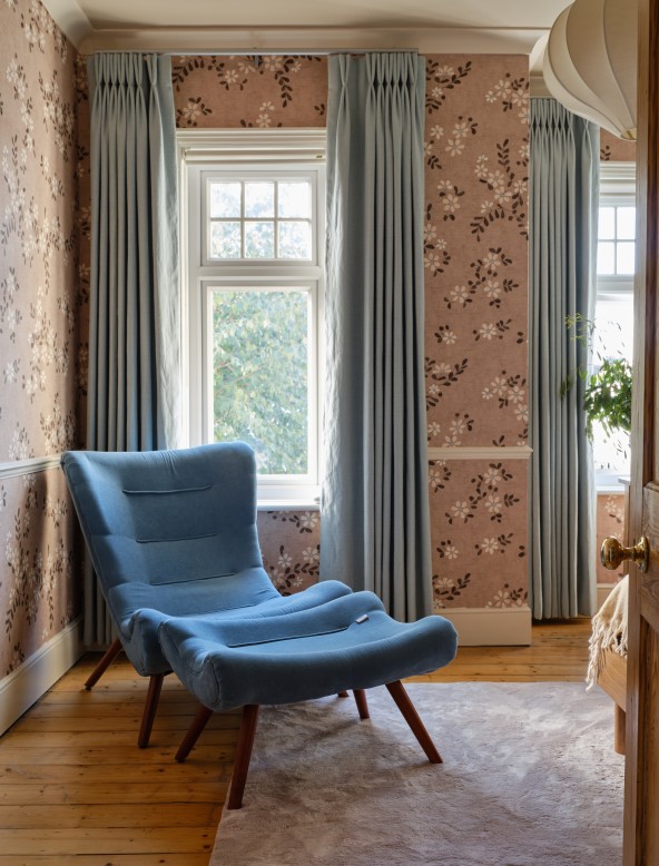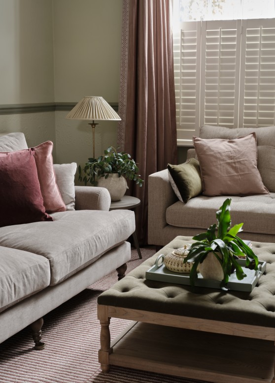 Widening the sitting room by adding tactile velvet curtains in the recess of the bay, with long sofas and a subtle stripe in the rug. Resting the curtains in the recess of the bay ensures maximum light comes into this north facing room. The colour palette is rich and homely strengthening the cosy and inviting atmosphere.